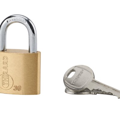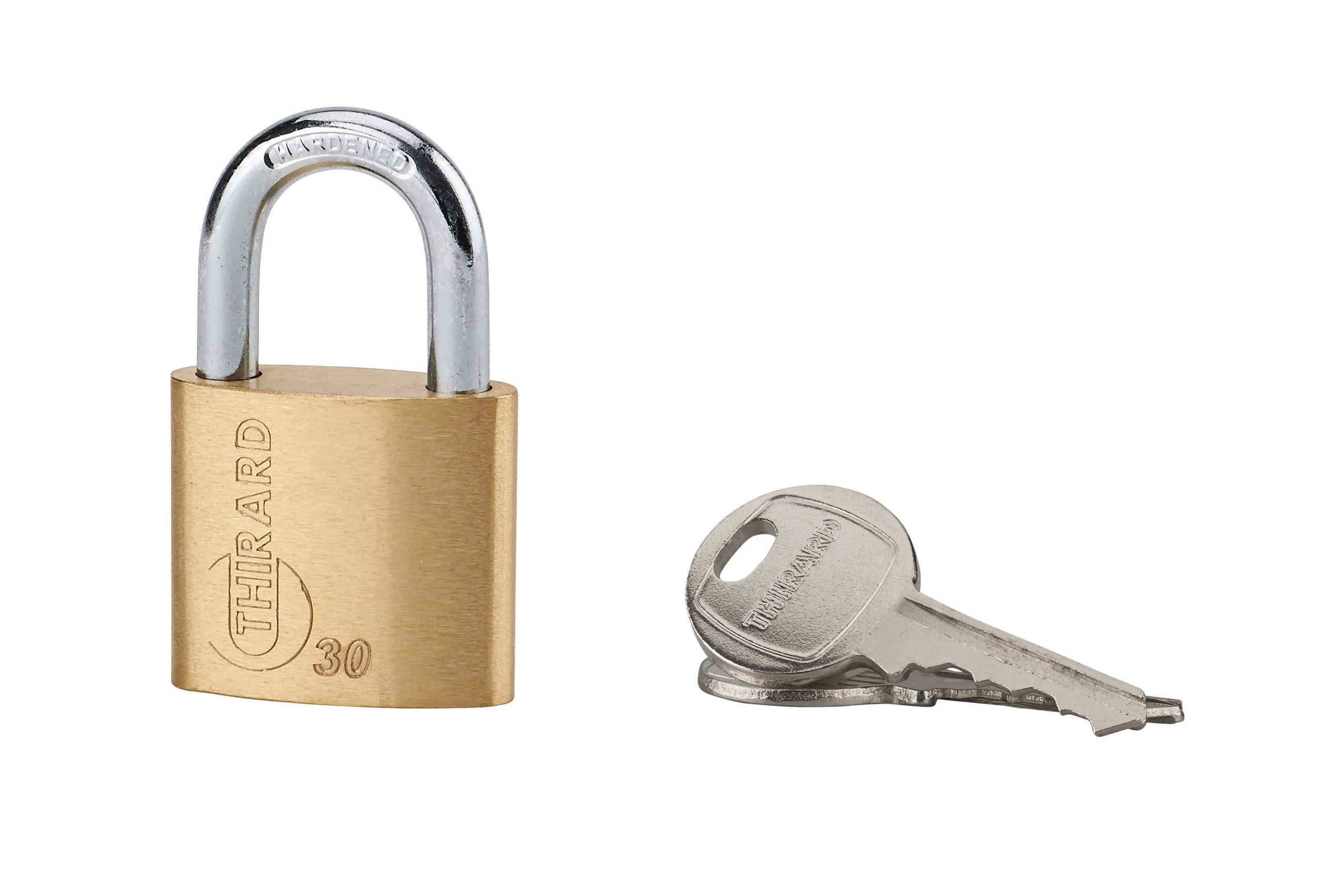 Description : One-piece brass body padlock. Nickel-plated cemented steel handle. Pin mechanism. Double anchoring. 2 nickel-plated brass keys. Finish: Polished brass Version: Additional keys on number. Padlock on imposed number and on the same combination. Use: Indoor