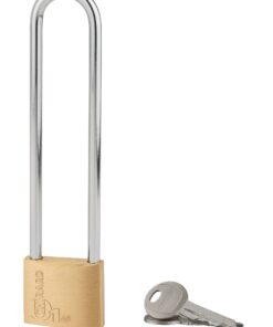 Description : One-piece brass body padlock. Nickel-plated cemented steel handle. Pin mechanism. Double anchoring. 2 nickel-plated steel keys. Finish: Polished brass Version: Single anchor for size 30 – 35 mm. Semi high handle for size 30-40-50 mm. High handle for size 40-45 mm. Additional keys on model. Without manufacturing on imposed number. Padlock on same combination for size 30, 35, 40, 45, 50 mm. Use: Indoor