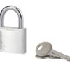 Description : Padlock Aluminum body. Nickel-plated cemented steel handle. Pin mechanism. Double anchoring. 2 nickel-plated brass keys. Finish: Aluminum Version: With PVC shell Use: Interior