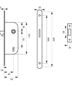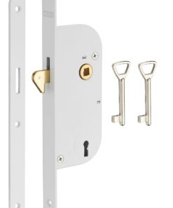 Description: Stamped steel chest. Steel headrest round tips. Steel hook bolt. Flat steel striker. Square 7 mm, centre distance 70 Finish: Epoxy white Version: Keyless – A condemnation – 2 keys. Use: Sliding interior door