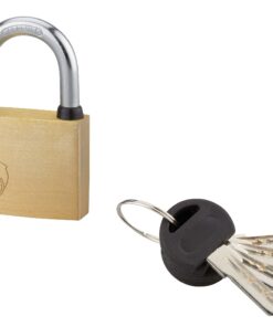 Description : One-piece brass body padlock. Nickel-plated cemented steel handle. Pin mechanism. Double anchoring. Gasket. Water flow hole. 4 reversible nickel-plated steel keys sheathed PVC. Finish: Polished brass Version: Use: Exterior