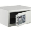 Description: Key closure. Asymmetrical double panel security lock with grooves. Locking by double bolt Ø 18mm. Prisoner key lock open. Trunk thickness: 1.5 mm. Door thickness: 3 mm. 4 Holes for attachment to the back and base (accessories provided). Finish: Epoxy beige Version: Use: Suitable for small valuables