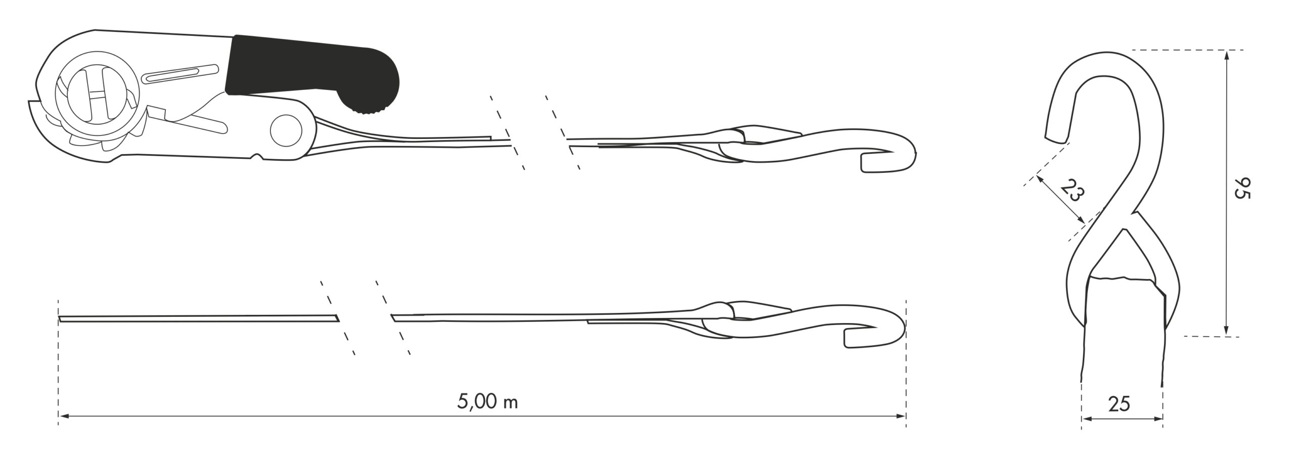 Description: Polyester ratchet strap with S hooks. Finish: 290609-290610-290611: Red 290612: Yellow Version: 25mm x 4.50m 25mm x 5.00m Use: Armour strap for motorcycle, trailer, moving.