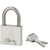 Description : Padlock Stainless steel body. Stainless steel handle. Pin mechanism. Double locking by stainless steel balls. “Prisoner” key: The padlock must be closed to take back the key. 2 reversible flat nickel-plated brass keys with property card, allowing the reproduction of keys exclusively in the factory. Finish: Brushed stainless steel Version: Use: Industry. Flow chart.
