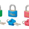 Description : Padlock Body brass monobloc sheathed PVC. Brass handle. Pin mechanism. Double anchoring. 2 PVC sheathed nickel-plated steel keys. Finish: PVC green, pink, blue, black and yellow Version: Additional keys on model. Without manufacturing on imposed number. Padlock on the same combination. for size 40 mm. Use: Outdoor