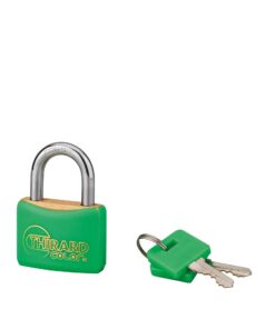 Description : PVC sheathed monobloc brass body. Nickel-plated cemented steel handle. Padlock Pin mechanism. Double anchoring. 2 PVC sheathed nickel-plated steel keys. Finish: GREEN, PINK, BLUE, BLACK AND YELLOW PVC. Version: Additional model keys. Without manufacturing on imposed number. Padlock on the same combination for size 40 mm. Use: Indoor
