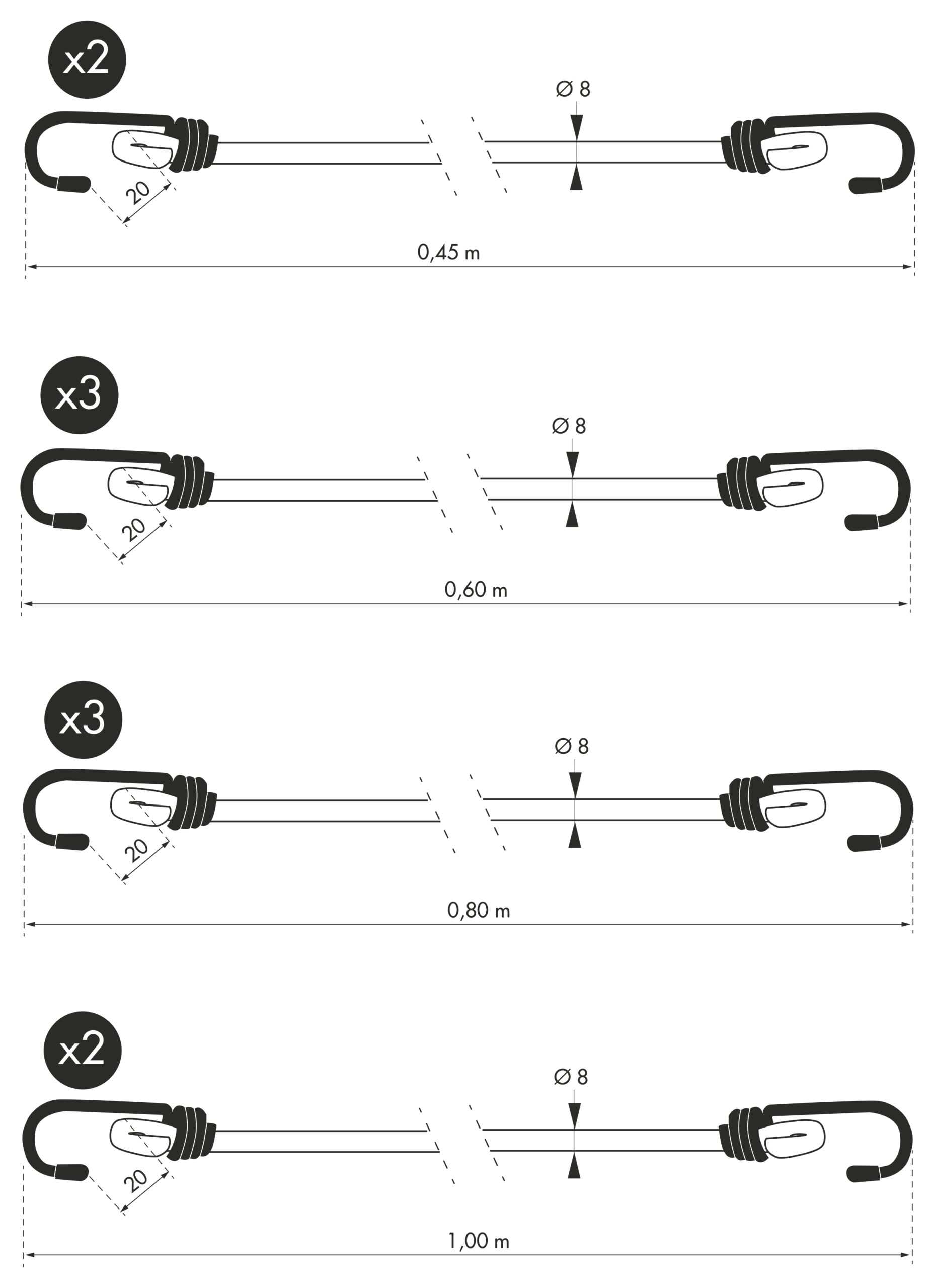 Description : Latex rubber cord, double steel hooks Finish : Assorted colors Version : Use : Storage, camping, bike, trolley, trailer ….