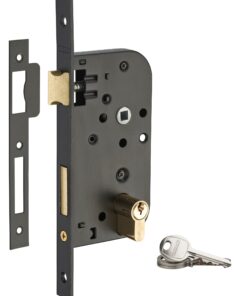 Description: Stamped steel chest. Steel headrest. Galvanized alloy U-turn. reversible without disassembling the trunk. Galvanized alloy bolt. Flat steel striker. 2-turn mechanism. Reminder of the 1/2 turn by the key. Square 7 mm, between axis 70 mm. Brass profile cylinder 30 x 30 mm. 3 nickel-plated steel wrenches. Finish: Epoxy black (V) Version: Square headrest (BC)Round headrest (BR) Use: