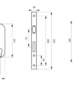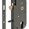 Description: Stamped steel chest. Steel headrest. Brass roller. Flat steel striker. Finish: Black Epoxy (V) Version: Square tip headrest (BC). Headrest round ends (BR). Headrest and brass striker. Headrest and stainless steel striker. With European profile cylinder 30 x 30 mm, 3 keys. Usage: