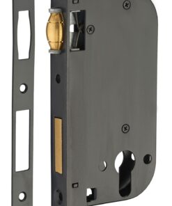 Description: Stamped steel chest. Steel headrest. Brass roller. Flat steel striker. Finish: Black Epoxy (V) Version: Square tip headrest (BC). Headrest round ends (BR). Headrest and brass striker. Headrest and stainless steel striker. With European profile cylinder 30 x 30 mm, 3 keys. Usage: