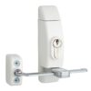 Description: Molded alloy body. 8 interlocking positions. Stop stop cleat that can be placed on the right or left. Child safety: can be padlocked with a 30 mm padlock. Finish: Lacquered white Version: Use: Window interlocking with 1 or 2 leaves.